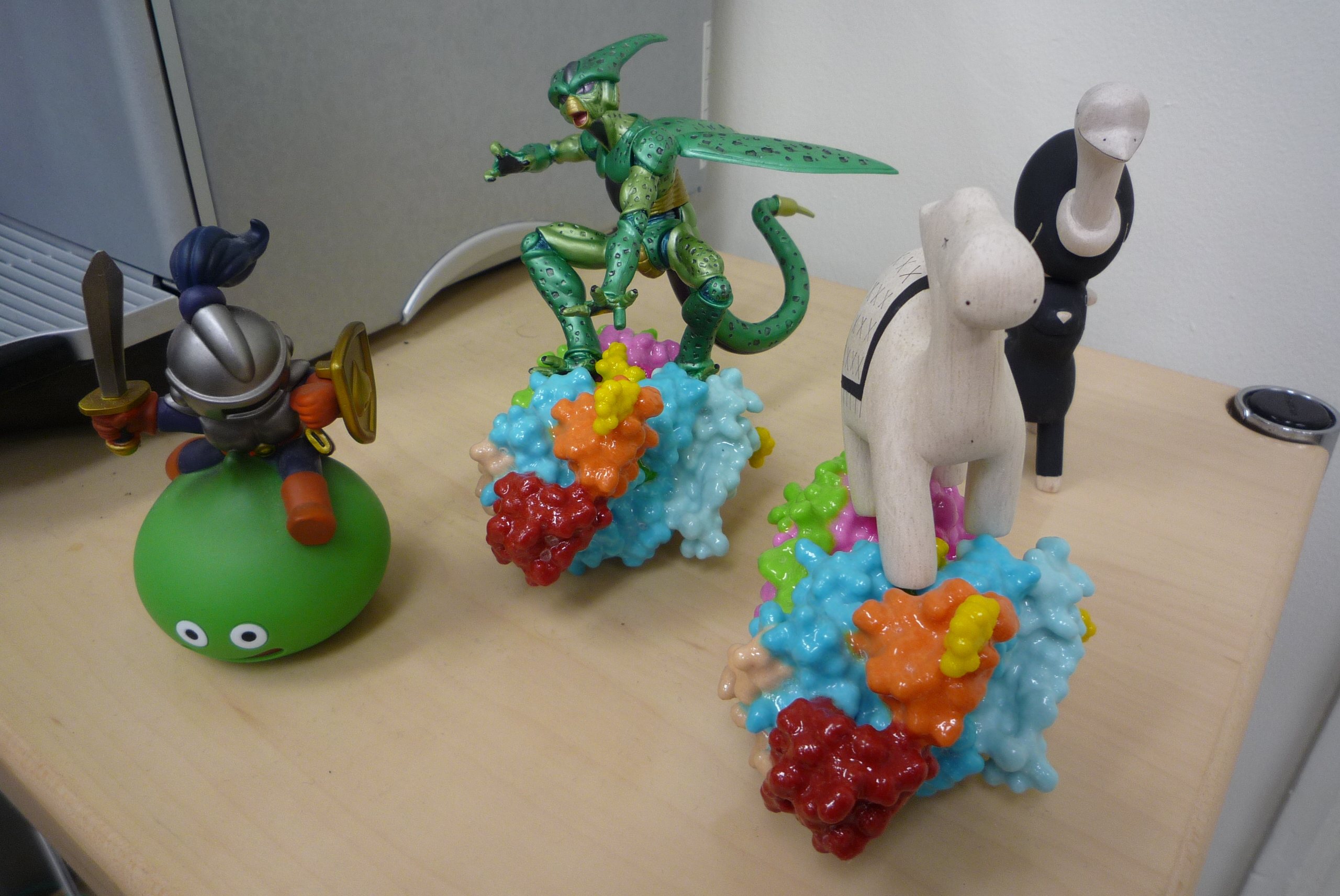 Et ce penchant se retrouve aussi au labo avec des arrangements hétéroclites comme celui-ci. Nous avons la un ‘Cell‘ de Dragon Ball, un ‘Slime Knight‘ de Dragon Quest (la série de jeu de rôle la plus célèbre au Japon), trois animaux en balsa, cadeaux de la société d’oligonucléotides pour 100 oligos achetés, et 2 moulages de la dernière structure de protéine résolue au laboratoire (et dont je tairais le prix indécent).